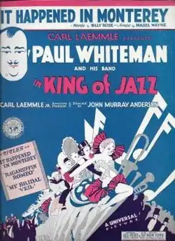 "It Happened in Monterey" was written for the 1930 musical film King of Jazz.[2] The film featured Paul Whiteman and his orchestra,[3] while the song, written in waltz time, was composed by Mabel Wayne, with lyrics by Billy Rose.[4][5] Though the lyrics refer to the city of Monterrey in "Old Mexico",[6] the song title was misspelled, leading to popular references to the city of Monterey, California.[7] The song was performed by John Boles and Jeanette Loff in the film.[8] The song appears in a sequence of disparate musical performances, each introduced by a caption card, that appear between the two main production numbers.[9]
