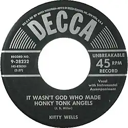 "It Wasn't God Who Made Honky Tonk Angels" is a 1952 country song written by J. D. "Jay" Miller, and recorded by Kitty Wells. It was an answer song to the Hank Thompson hit "The Wild Side of Life". First performed by Al Montgomery as "Did God Make Honky Tonk Angels" on the Feature label which was owned by songwriter J.D. Miller.[2]
