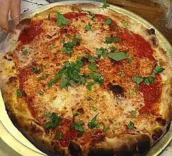the most common form of American pizza is based on (and called) the Neapolitan style, the earliest and essentially standard version of which is commonly called New York–style. Also popular in America is a version of the Sicilian pizza, a larger square pizza in which the dough is risen an inch or more, and which is topped (contrary to native Sicilian tradition) in much the same way as the thin-crusted round Neapolitan form, including the use of mozzarella. Even more Americanized forms such as Greek pizza, apizza (i.e. New Haven–style pizza) and Chicago-style have become common. |