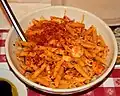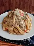 Derived from the fettuccine Alfredo made popular by Roman restaurateur Alfredo di Lelio[24] starting in 1914. American Alfredo sauce consists largely of cream, butter, and Parmigiano Reggiano cheese with nutmeg and black pepper seasonings, and is served over vegetables and some meats (particularly chicken and shellfish), as well as the signature pasta ribbons. The authentic Alfredo dish only consists of fettuccine pasta, butter and Parmigiano Reggiano. The primary difference between authentic fettuccine Alfredo and Alfredo sauce is that while the pasta dish is prepared by adding ingredients to the cooked pasta, Alfredo sauce is prepared in bulk and poured over pasta or other ingredients (vegetables such as broccoli and meats such as shrimp or grilled chicken are common additions). Although very popular in the United States, this sauce is virtually unheard of in Italy.[25] |