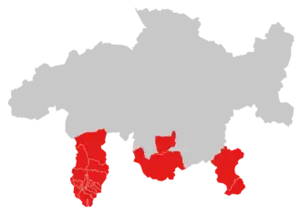 Located in the southernmost part of the canton, it comprises (from west to east) of the region of Moesa, the municipality of Bregaglia in the Region of Maloja and the region of Bernina. It has a population of about 15,000, of which more than 85% speak standard Italian or Lombard.[1] The village and former municipality in Bivio in the district of Albula, located to the north of Bregaglia, once had an Italian-speaking plurality as well. Between 1980 and 1990, however, it was overtaken by German, which is now the majority language of the village.