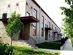 Residences in Italian Village are predominantly influenced by the Italianate and Queen Anne architectural styles.[2] The Italianate style is defined by vertical proportions, asymmetrical floor plans, and low-pitched roofs as well as ornamental brackets at the cornice and decorative woodwork on porches.[2] Characteristics of the Queen Anne style include steeply-pitch, irregularly shaped rooflines, asymmetrical massing, and numerous different window treatments.[2] In Italian Village, residential buildings are set on narrow lots, close to each other and close to the street with alleys in the rear.[2] Each house is typically two to two and a half stories high and has either a hipped or gabled roof, characteristic of Italianate style architecture.[2] Rowhouses are constructed of brick with flat roofs and Italianate decorative cornices. The American Four Square House is common within the village, reflecting Italian architectural elements like the hipped/gabled roof and a broad front porch.[2]