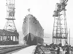 Roma's keel was laid down by the Italian shipbuilder Cantieri Riuniti dell'Adriatico on 18 September 1938, and she was launched on 9 June 1940. After just over two years of fitting-out, the new battleship was commissioned into the Regia Marina on 14 June 1942. She arrived in the major naval base of Taranto on 21 August, and was assigned to the Ninth Naval Division.[3] Although Roma took part in training exercises and was moved to various bases including Taranto, Naples, and La Spezia, in the next year, she did not go on any combat missions as the Italian Navy was desperately short of fuel. In fact, by the end of 1942, the only combat-ready battleships in the navy were the three Littorios because the fuel shortage had caused the four modernized battleships to be removed from service. When combined with a lack of capable vessels to escort the capital ships, the combat potential of the Italian Navy was virtually non-existent.[11][12]