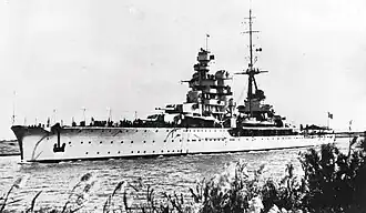 The commander of the 1st Division briefly transferred his flag to Gorizia's sister ship Pola on 31 December, before returning to Gorizia on 3 June 1935. The ship was sent to Spanish waters on 24 July 1936 to evacuate Italian nationals from the port of Gijón during the Spanish Civil War. She passed through the Strait of Gibraltar on 29 July and arrived in Gijon on the 31st. After embarking the Italian nationals on 1 August, Gorizia cruised to Le Verdon-sur-Mer, France, where they were disembarked between 1 and 4 August. The next day, the ship departed for Germany, arriving in Kiel on 8 August for a naval review with the German heavy cruiser Admiral Graf Spee, the light cruiser Königsberg, and the British cruiser HMS Neptune. Gorizia remained in Kiel to show the flag during the 1936 Summer Olympics, as the sailing events for the Berlin games were held in Kiel.[3]