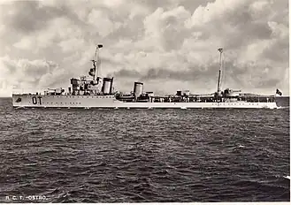Ostro was laid down by Gio. Ansaldo & C. at their Genoa shipyard on 29 April 1925, launched on 2 January 1928 and completed on 9 October.[1] Upon her completion, Ostro, together with other vessels of her class conducted exercises in the Tyrrhenian Sea and visited Monaco to attend the celebrations of the local Italian community.[5] Together with Espero, Zeffiro and Borea the ship was assigned to the 1st Squadron of the I Destroyer Flotilla based at La Spezia.[6] In 1929 she carried out a training cruise of the coast of Spain, and in 1930 another one in the Dodecanese and Aegean Sea.[5][7] In 1931 Ostro together with Turbine, Aquilone and Borea as well as older Daniele Manin, Giovanni Nicotera and Pantera formed 1st Destroyer Flotilla, part of II Naval Division.[8] In 1934 after another reorganization Ostro as well as Espero, Zeffiro and Borea were again reunited, now forming the 4th Destroyer Squadron, part of II Naval Division.[9]