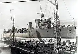 The Turbines were powered by two Parsons geared steam turbines, each driving one propeller shaft using steam supplied by three Thornycroft boilers. The turbines were rated at 40,000 shaft horsepower (30,000 kW) for a speed of 33 knots (61 km/h; 38 mph) in service,[3] although her sister ships reached speeds in excess of 36 knots (67 km/h; 41 mph) during their sea trials while lightly loaded.[4] They carried enough fuel oil to give them a range of 3,200 nautical miles (5,900 km; 3,700 mi) at a speed of 14 knots (26 km/h; 16 mph).[1]