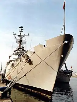The ship was upgraded during a refit that ended in June 1985. A new SQS-43 hull-mounted sonar was fitted and the variable depth sonar rendered inoperable.[14] A SLQ-747 ECM suite was fitted, replacing the SLQ-D.[1] The vessel was also equipped with the SCLAR decoy-dispenser system which used chaff, flares and other decoys as a form of missile defense.[6]