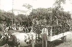 The 1930s were difficult for the peasants and the proletarianized urban workers, but still, they participated in the apotheosis. They joined the parades of floats of the Festa da Uva, with their tools and work clothes under the frenzied applause of the visiting crowd. The feast became a tourist success in the state in a few years, understood as the main stage for ideological, identity and community representations of "Italianness", receiving collaborators and exhibitors from all over the colonial region and the approval of distinguished Portuguese-Brazilian intellectuals and politicians.[32][34]
