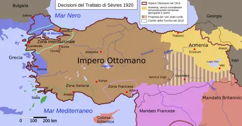 The Paris Peace Conference, following the events of World War I, was articulated with a series of treaties with the individual defeated nations. The Ottoman Empire led to the Treaty of Sèvres (10 August 1920), which recognized Italy's area of influence on Antalya and its surroundings, as well as the possession of the Dodecanese, and the Greek occupation of Smyrna and its surroundings.