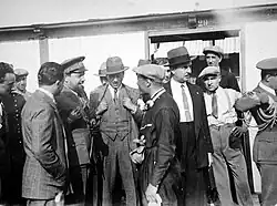 During Balbo's stay in the United States, President Franklin Roosevelt invited him to lunch and presented him with the Distinguished Flying Cross.[17] He was awarded the 1931 Harmon Trophy. The Sioux even honorarily adopted Balbo as "Chief Flying Eagle".[18] Balbo received a warm welcome in the United States, especially from the large Italian-American populations in Chicago and New York City. To a cheering mass in Madison Square Garden, he said: "Be proud you are Italians. Mussolini has ended the era of humiliations."[19] The term "Balbo" entered common usage to describe any large formation of aircraft.
