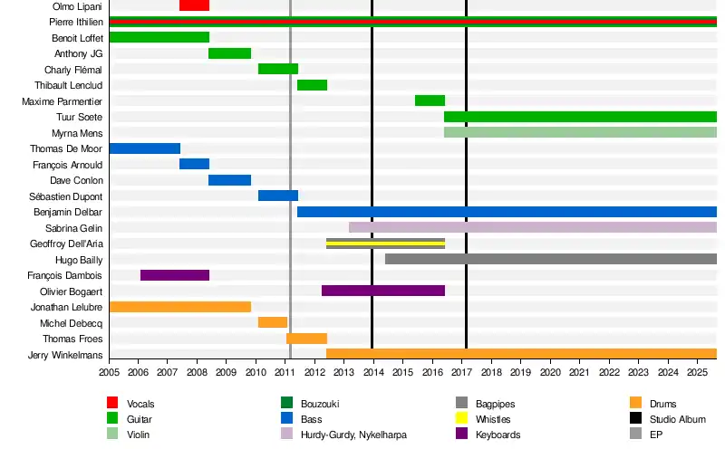 Over time, other members were added such as Hugo Bailly to the bagpipes and Sabrina Gelin to the hurdy-gurdy, both in 2014. An even more privileged place is then made to the folkloric instruments within the band.[9]