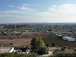 Itria Valley (in Italian: Valle d'Itria) is an area located in Apulia region, in Southern Italy. Itria Valley spreads over Province of Bari, Province of Brindisi and Province of Taranto, and coincide with the lower part of Murgia upland (Low Murgia). The towns of Martina Franca, Locorotondo, Cisternino and Ceglie Messapica overlook Itria Valley. "Valley" is an inaccurate term, because Itria Valley has not the typical conformation of mountain area valleys: it is just a depression due to karstic phenomena.