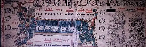 In the New Year pages of the Dresden Codex, Itzamna is given a role similar to that described by Landa. The version of Itzamna depicted in the codices is very similar to the much earlier depictions in Classic iconography.[5] In comparison with the early-colonial descriptions, Classic scenes are more suggestive of narrative traditions, at times subjecting Itzamna to the actions of others: He can, for example, be shown clinging to the back of a peccary or a deer; held ready for sacrifice; or being shot at in his bird avatar.