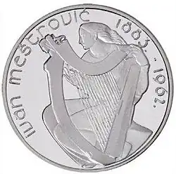 - ^ "Notes and Coins" Archived 2007-09-27 at the Wayback Machine - Central Bank and Financial Services Authority of Ireland. "This beautiful Silver Proof €15 coin celebrates the 80th anniversary of the original coin design 'Girl with Harp' which was gifted to the Irish State by Ivan Meštrović in 1927. This design was submitted by the artist as an entry in the competition for the design of the 1928 Irish Free State coinage. Unfortunately, because of difficulty contacting him – he was in the United States - his design arrived too late for consideration. The Chairman of the Design Committee, William Butler Yeats, subsequently wrote "He made one magnificent design and, on discovering that the date had passed, gave it to the Irish Free State with great generosity". It has been used as the seal of the Central Bank since 1965.