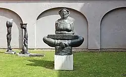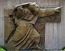 During the April War in 1941 Meštrović was living in Split. After being warned by novelist and Independent State of Croatia (NDH) minister Mile Budak that the Croatian authorities could not guarantee his safety in Split, he moved to Zagreb in September 1941.[14] Meštrović and painter Jozo Kljaković were arrested by the Ustaše in Zagreb on 7 November 1941, ostensibly due to the regime's fears that the two would emigrate. He eventually served three and a half months in the Savska Cesta prison. With help from archbishop Aloysius Stepinac and subsequently the Vatican he was released, on condition that he travel to Venice to attend the Independent State of Croatia pavilion at the Venice Biennale. From there he relocated to Rome, where he stayed and worked at the Pontifical Croatian College of St. Jerome. He was sponsored here by Fra Dominik Mandić, and during his time in the city was received by Pope Pius XII. In July 1943, Meštrović secured a visa to Switzerland through NDH diplomat Stijepo Perić and moved there. Not all of his family managed to escape — his first wife Ruža died in 1942 and many from her Jewish family were murdered in the Holocaust. Later, his brother Petar was imprisoned for publicly advising Ivan not to return to the country.[15] Looking to create a more favorable image of the newly established socialist regime in Yugoslavia, Marshal Josip Broz Tito's government invited Meštrović to return to the country after World War II ended, but he refused to do so. His decision was final after he received a letter from a high-ranking communist official warning him that he would be given a prominent position such as at a national academy and expected to display complete obedience to the Communist Party.[15] In 1946, Syracuse University offered him a professorship, and he moved to the United States.[16] He became the first artist of Croatian origin to exhibit his work at the Metropolitan Museum of Art in New York City in 1947.[8]