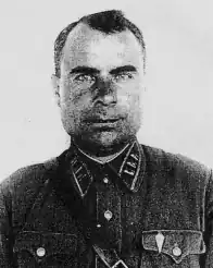 After Operation Barbarossa, the German invasion of the Soviet Union, began on 22 June 1941, several new rifle divisions were formed under the command of officers from the NKVD Border Troops. Gorbachyov was among those officers and on 27 June was appointed commander of the 250th Rifle Division, which began formation in Vladimir soon after. The officers were drawn from the NKVD Border Troops, while the enlisted men were called-up reservists. The 250th was relocated to the Rzhev area on 15 July, the same day that Gorbachyov was promoted to major general. From there the division marched through Olenino to positions south of Belyi. The division was assigned to the 30th Army and entered the Battle of Smolensk on 22 July, counterattacking towards Dukhovshchina to stop the German advance. Two days later, Gorbachyov and the division commissar visited elements of the 250th at Demyakhi. As Gorbachyov left the staff car that they arrived in at the entrance to the village and went to personally inspect the defenses, he was mortally wounded by shrapnel from a German artillery shell.[1] Gorbachyov died of his wounds in a field hospital on the next day, and was buried in Olenino.[2][3]