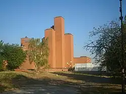 In 1967, Raspopović and Antić were asked to build the "21 October Museum", located in the Šumarice Memorial Park in Kragujevac.[7][8] Designed with 33 projecting rectangles of different heights,[9] the facade was covered with specially made exposed bricks.[2][8] Finally completed in 1976, the museum was dedicated to the casualties of the World War 2 Kragujevac massacre. With no windows in the building’s walls, the interior space felt closed and inverted, representing the hopelessness felt by the victims before they died.[10]