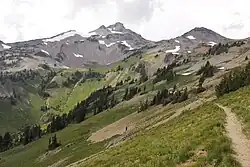 Ives Peak, elevation 7,920+ ft (2,410+ m), is located in the Goat Rocks on the border of Lewis and Yakima Counties, in the U.S. state of Washington. Ives Peak is within the Goat Rocks Wilderness and the McCall Glacier on its eastern slopes. Additionally, the Pacific Crest National Scenic Trail is near the west slopes of the peak.[3] Precipitation runoff from the peak's east slope drains to the Tieton River, whereas the west slope drains into the Cispus River. Ives Peak ranks as the fourth-highest peak in the Goat Rocks Wilderness.[4]