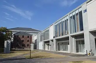 The library was damaged by the Great Mikawa Earthquake in 1945. The original brick building survived and has been registered as a National Tangible Cultural Property.[4] The current building is "a modern, glass-and-concrete structure built in 2003", located on the same premises as the Nishio City Library.[2]