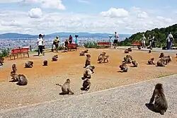 Iwatayama Monkey Park (Japanese: 嵐山モンキーパーク, Arashiyama Monkī Pāku) is a commercial park located in Arashiyama in Kyoto, Japan. The park is located atop Mount Arashiyama, on the opposite side of the Ōi River of the train station. It is inhabited by a troop of over 120 Japanese macaque monkeys.[1] The animals are wild but can be fed by the staff and visitors with food exclusively purchased at the site.[2] The main reason why these wild macaques choose to stay in the park is so that they can feed on the food given by the staff. The feeding system includes corn and wheat handed out every two hours from 9:30 to 5:30 (five times a day).[3]