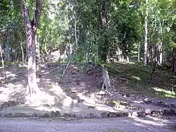 Four Classic Period sculpted monuments were recovered from the site, two stelae and two altars.[17] Ixlu Stela 1 bears the date 879 AD, in the Late Classic Period, and depicts a ruler who used the Tikal Emblem Glyph and the K'ul Mutul Ahaw title ("holy lord of Tikal").[18] The stelae at Ixlu resemble traditional Classic Period stelae such as those at Tikal.[19] Both Stelae 1 and 2 show bloodletting rituals and the materialisation of the Paddler Gods.[19] Ixlu Stela 2 is now located in the main plaza of Flores.[20]