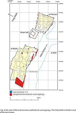 In 2011, excavation and survey partly confirmed Schreiber's results. The town contains the remains of the entire pre-Islamic period. Numerous were the finds of the Early Iron Age and Late Iron Age.[2] Particularly eroded and disturbed was al-Nizar. Excavation of the highest part of Al-Yemen revealed an older mosque, presumably that destroyed during the civil war (886-970 AD).