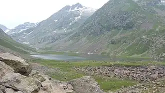 Izmis Lake is a lake in Swat District, Khyber Pakhtunkhwa, Pakistan, located to the south-west of Utror valley at a high altitude above the treeline. The name Izmis means "caves" in Kohistani, and as the lake is surrounded by several natural caves, the people have named the lake after these caves. A small jeep-able link road from Utror leads part of the way to the lake, ending in a valley called Loypanrghalay. The lake can be accessed from here after trekking for almost 3–6 hours.[1]