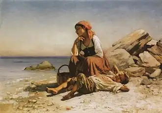 It was there he first felt the desire to visit Italy. He toured Capri and spent some time in Rome, participating in a few exhibitions. In 1878, he returned to Munich and produced paintings showing his newly acquired Italian influences, but remained only a short time before settling permanently in Nádasdladány.[1] In addition to his canvases, he was commissioned by Count Ferenc Nádasdy (1801-1883), the former Chancellor of Transylvania, to paint an altarpiece depicting Saint Helena in memory of the Count's wife.[2]