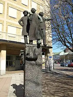 Järntorget ("The Iron Square") was named after the now-demolished scale which once stood on the site. It was used for weighing iron to be exported from the city's harbour. The former site of the scale is now occupied by a large, granite fountain called De fem världsdelarna. The fountain includes sculptures featuring five bronze naked, female figures representing five continents: Africa, America, Asia, Europe and Oceania. The fountain and the sculptures were the work of Swedish sculptor Tore Strindberg (1882–1968). The plinth in the centre of the fountain is decorated with the stamps which were used by the large number of Swedish iron merchants which once traded in the city. The fountain was first erected in 1927 and has been moved twice since then.[2][3]