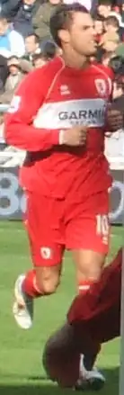 Middlesbrough signed Aliadière on 19 June 2007, for an initial fee of £2 million.[29] He scored his first goal in a Premier League match against Manchester United at Old Trafford in October 2007, with a header to draw level at 1–1, before Middlesbrough went on to lose the game 4–1.[30] This was his first Premier League goal, since scoring his first ever for Arsenal on 27 August 2002. He scored for Middlesbrough against old club Arsenal on 15 March in a 1–1 draw,[31] before rounding off the season, scoring in the final day 8–1 victory over Manchester City on 11 May 2008.[32]