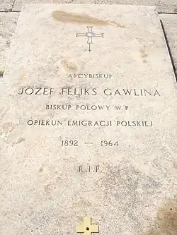 Józef Feliks Gawlina, born in 1892 in Strzybnik (Racibórz County) in Silesia - died 1964 in Rome was a Divisional general in the Polish Armed Forces. He was an ordained priest, Doctor of Theology and from 1933, Catholic bishop in the Military Ordinariate of Poland.[1] After the Second World War, cardinal Hlond gave him the brief to provide pastoral care to the Polish diaspora. In the words of Pope John Paul II, Gawlina was a "bishop - Nomad". He was raised to the rank of Archbishop in 1957. Following his death, the Secretary General of the Second Vatican Council described him as a "real pastor".