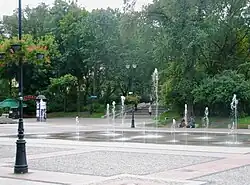 At the beginning of the 21st century, the entire park square was rebuilt again, and in 2003, a stone sidewalk in the form of a fountain was made in front of the theater building, with water gushing out in many streams, directly from an underground reservoir. In 2007, some of the alleys were paved with stones and slabs, creating the central square of the park in the form of a rectangle, which was named Marshal Józef Piłsudski Square. The Aleksandr Węgierki Drama Theatre, Białystok (located officially in the address Elektryczna 12) built in 1933 is located in the park.[5][6]