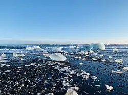 Jökulsárlón (Icelandic pronunciation: [ˈjœːkʏlsˌaurˌlouːn] ⓘ; translates to "glacial river lagoon") is a large glacial lake in southern part of Vatnajökull National Park, Iceland. Situated at the head of the Breiðamerkurjökull glacier, it developed into a lake after the glacier started receding in the late 19th century. The lake has grown since then at varying rates because of melting of the glaciers. The glacial front is now about 8 km (5.0 mi) away from the ocean's edge and the lake covers an area of about 25 km2 (9.7 sq mi). In 2009 it was reported to be the deepest lake in Iceland, at over 284 m (932 ft), as glacial retreat extended its boundaries.[2] The size of the lake has increased fourfold since the 1970s.[3][4][5][6]