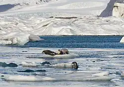 The lake is filled with fish that drift in from the sea along with the tides. Seals gather in large numbers at the mouth of the lake to catch fish during the winter. Large numbers of seabirds, particularly Arctic terns, which nest nearby, gather to catch herring, trout, salmon, krill and other fish. Breiðamerkursandur (the large sand deposits in the area) is the main habitat of the Arctic skua (Stercorarius parasiticus).[6][12] During the summer season, the gull-like skuas have their nests on the lake's shores. The skuas, fat and dark in colour with white wingtips, are said to be aggressive "pirates of the seas", which harass other birds as big as gannets. They also kill and eat smaller birds such as puffins. Great skuas are not afraid of human beings and also do not tolerate human beings close to their nests. These birds are reported to migrate from their wintering grounds off the coasts of Spain and Africa. Seals are seen either swimming in the lagoon or lying on icebergs. Many times, the tides carry shoals of herring or capelan into the lagoon by the tide and the birds feast on them.[13]