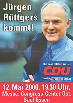 Amid the revelations of the CDU donations scandal in early 2000, Rüttgers – who ran as the party's candidate in a crucial state election in North Rhine-Wesphalia that year – was one of the few leading figures who remained loyal to former Chancellor Helmut Kohl even after prosecutors began a criminal investigation into Kohl's financial dealings.[6] By January 2000, daily newspaper Süddeutsche Zeitung claimed that Kohl, angered by party chairman Wolfgang Schäuble's efforts to distance himself from the scandal surrounding secret payments to the party, was encouraging Rüttgers to make a bid for the leadership at the CDU's annual conference; instead, Angela Merkel was elected as Schäuble's successor[6] and Rüttgers became one of her four deputies, alongside Volker Rühe, Annette Schavan and Christian Wulff.[7]