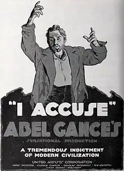 J'accuse is a 1919 French silent film directed by Abel Gance. It juxtaposes a romantic drama with the background of the horrors of World War I, and it is sometimes described as a pacifist or anti-war film.[1] Work on the film began in 1918, and some scenes were filmed on real battlefields. The film's powerful depiction of wartime suffering, particularly its climactic sequence of the "return of the dead", made it an international success and confirmed Gance as one of the most important directors in Europe.[2]
