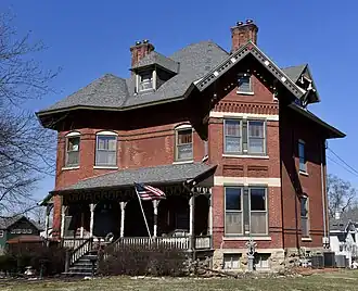 The J.E. Squiers House, also known as the Squiers Manor Bed and Breakfast, is a historic building located in Maquoketa, Iowa, United States. The architectural and historic significance of this house is attributed to its being "a well-preserved example of late nineteenth century domestic architecture in Maquoketa's most prominent residential neighborhood and for its association with the life and career of James Emery Squiers, a prominent local businessman."[2] Built in 1882, the 21⁄2-story brick house features elements consistent with the Queen Anne and Stick styles. It follows a central hall floor plan with two rectangular projecting bays, a three-sided bay window, a kitchen addition on the back, and a hipped roof with intersecting gable sections.