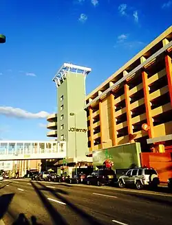 The loss of parking which resulted, led the company to construct Anchorage's first public parking garage, which opened in 1968.[4] The garage is connected to the store by a second-level skywalk spanning Sixth Avenue. Over the decades, the garage's ground level, known mostly as the Penney Mall, housed a variety of retail businesses, both operated by the company and by other merchants. A People Mover "mini transit center" was located underneath the entrance ramp for many years. It was torn down when the bus stops for the Penney Mall and the federal building on Seventh Avenue were moved elsewhere. Another structure currently occupies that space.