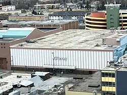 J. C. Penney built its first Alaska store in 1962, located on the southwest corner of Fifth Avenue and D Street in downtown Anchorage. The company acquired the site by executing a 55-year lease with Hoyt Motors, one of Anchorage's earliest automobile dealerships.[1] Hoyt Motors folded upon vacating the site, part of a trend in early 1960s Anchorage of dealerships changing ownership and moving out of downtown and to the Glenn Highway and Seward Highway corridors.