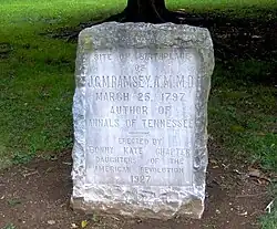 During his lifetime, Ramsey helped establish the East Tennessee Medical Society, serving as its first president, as well as the East Tennessee Historical Society, serving as its first recording secretary.[1] After the war, he served as president of the Tennessee Historical Society.[6] The stone house of Ramsey's father, completed the year of Ramsey's birth, still stands on Thorngrove Pike in East Knoxville, and is currently a museum.