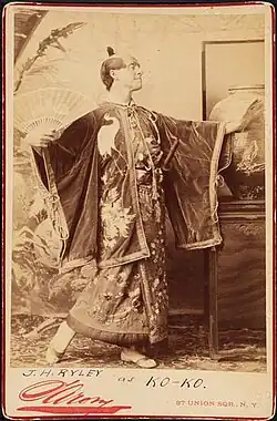 Ryley appeared in leading roles in all of the New York productions of the D'Oyly Carte Opera Company until 1883. He was Captain Felix Flapper in Billee Taylor (1881), Reginald Bunthorne in Patience (1881–82), Blood Red Bill in Edward Solomon's Claude Duval (1882), Philip of Aragon and Don Jose de Mantilla Les Manteaux Noirs (1882), Peter van Dunk in Rip Van Winkle (1882, with Selina Dolaro), and the Lord Chancellor in Iolanthe and Mr. Cox in Cox and Box (1882–83).[7] He continued to appear in major Gilbert and Sullivan productions in America after leaving the company. In 1884, he played King Gama in New York's first production of Princess Ida at the Fifth Avenue Theatre and also starred in Falka at the Casino Theatre.[8] In 1885, he played Ko-Ko in The Mikado at the Standard Theatre in New York and then in Chicago.[3]