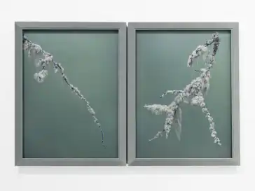 Priola’s "Natural Light" project encompassed exhibitions at Anglim/Trimble (in 2019 and 2023) and his second book, which gathered twelve series spanning over twenty years.[23][2][6] Collectively, the various series explore dichotomies of nature and nurture, natural and unnatural, survival and destruction through highly detailed, often dense images of wild or symbiotic (e.g., Parasite, 2017), domestic, dead and synthetic plants.[21][2][6] Like Priola's past work, they functioned metaphorically as vehicles to deeper meaning: borrowed houseplants against inky black backgrounds serving as portraits of their owners; surreal foliage arrangements framing central deep black voids to suggest loss; subtly anthropomorphic, ikebana-like compositions of synthetic flowers.[10][39][6] Comparing these works to images of bare grey pine tree trunks illuminated against black, Mark Van Proyen wrote, "therein lies the underlying drama of Priola’s new photographs: They reveal the sharp and subtle juxtaposition of dormant and living forms, echoing the split history of photography understood as one of technically codified verisimilitude and another of elegiac evocation."[2]