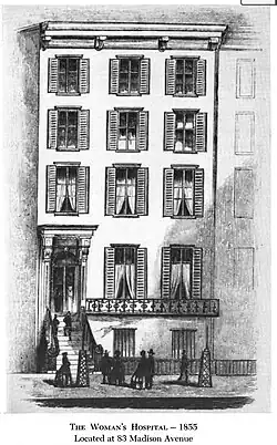In 1855 he founded the Woman's Hospital, which, not counting his own backyard infirmary, was the first hospital for women in the United States. At its inception, Woman's Hospital's primary purpose was to repair vesico-vaginal fistulas using Sims' technique,[62]: 24 in service to the poor. No "pay patients" were admitted.[13]: 299 Located on Madison Avenue and 29th Street in a rented four-story house, a location deliberately chosen near Sims' home, the hospital's thirty beds were quickly filled. In the beginning, Sims operated without assistance from other doctors, performing one fistula repair each day. Many of his patients were poor Irish immigrant women.[63][64]