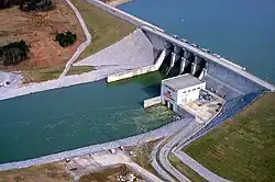 In 1979 the dam was bombed with dynamite as ruse to cover a crime spree supposed to have taken place in the resultant massive flooding. The conspirators succeeded only in destroying some iron doors at the dam's base. The suspects were later convicted and sentenced to substantial prison terms.[3]