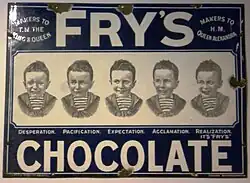 In April 2020, an original enamel advertising sign with the distinctive "five boys" trademark design was featured on BBC's Antiques Roadshow and was valued at £1,000-£1,500.[26] The distinctive "five boys" design expressing "Desperation, Pacification, Expectation, Acclamation and Realisation "It's Fry's" references Queen Alexandra, indicating a production date before her death in 1925. On a tour of the Fry's Bristol factory when in his eighties, Lindsay Poulton, the boy featured in the design, recalled that his father had induced him to cry, for the first photograph, "Desperation", by wrapping an ammonia-soaked cloth around his neck.[27]