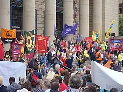In Birmingham, 220 city schools closed and care workers, street cleaners, job centre staff, court staff and a general rafting of other public workers joined the one-day strike, which was called by members of the National Union of Teachers, Association of Teachers and Lecturers, University and College Union and Public and Commercial Services union and UNISON. 51 schools saw partial strike action, with at least 600 disrupted or shut across the West Midlands.[23] A total of 5,000 striking public sector workers gathered for rally in Birmingham city centre making it the third biggest outside London.[23][24] Around 72,500 of the collective unions' members in the Midlands voted in favour of strike action and Birmingham City Council's workers also joined the strike over a new employment contract issued by Birmingham City Council.[24] This was one of the few major rallies outside London.[24]