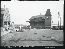 In 1845, the Old Colony Railroad opened between Boston and Plymouth, Massachusetts.[11] Crescent Avenue was a flag stop for South Braintree and Dorchester and Milton Branch trains by 1848.[12] A station building was opened at Crescent Avenue on November 2, 1868, and replaced in 1883.[13][5][14] The Old Colony Railroad was an early proponent of decorating the grounds of its train stations. By 1891, flowers were planted to spell "☾ AVE" at the station.[15]
