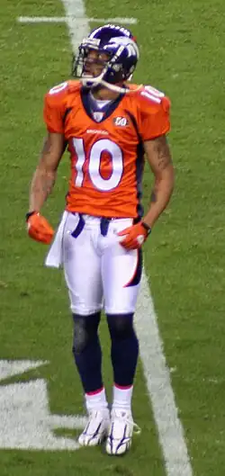 Derrick Jabar Gaffney (born December 1, 1980) is an American former professional football player who was a wide receiver in the National Football League (NFL). He played college football for the Florida Gators, earning unanimous All-American honors in 2001. He was selected by the Houston Texans in the second round of the 2002 NFL draft, and also played in the NFL for the New England Patriots, Denver Broncos, Washington Redskins, and Miami Dolphins.