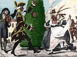 The first known textual account of the Jack in the Green tradition was written in 1770 by a Frenchman who had visited London and observed a May Day procession, Peter Grosley.[15] The earliest known reference to the term "Jack in the Green" comes from 1785, where it was referred to in a report in The Times newspaper that gave an account of a masquerade that was held at the Pantheon in London. The event would have been a largely upper-class affair, and was attended by the Prince of Wales.[16] The earliest possible pictorial reference to a Jack in the Green comes from a picture titled "May Day" that was produced between 1775 and 1785. This image featured a procession in which three garlands of metal objects are in the foreground, but in the background of the image is something that resembles a foliate Jack in the Green.[17] A clearer depiction of a Jack in the Green was featured in a 1795 engraving, perhaps by Isaac Cruikshank, which included the foliate figure alongside a fiddler with a wooden leg, a man, and a cross-dressed "May Queen"; in the background are dancing chimney sweeps.[4]
