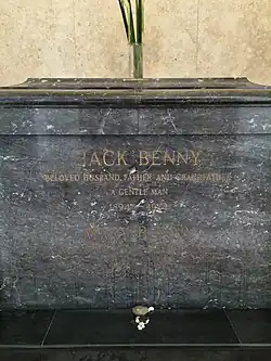 His funeral at Hillside Memorial Park Cemetery in Culver City, California on December 29 had 1,800 attendees; it was the biggest funeral for a Hollywood personality since Harry Cohn in 1958.[31] Burns, Benny's best friend for more than fifty years, attempted to deliver a eulogy but broke down shortly after he began and was unable to continue. Hope also delivered a eulogy in which he stated, "For a man who was the undisputed master of comedic timing, you would have to say this is the only time when Jack Benny's timing was all wrong. He left us much too soon."[32] Pallbearers included Sinatra, Mervyn LeRoy, Gregory Peck, Milton Berle, Billy Wilder, Irving Fein, Leonard Gershe, Fred de Cordova and Armand Deutsch.[31] Benny was interred in the main mausoleum of the cemetery.[31][33] His will arranged for a single long-stemmed red rose to be delivered to his widow, Mary Livingstone, every day for the rest of her life.[34] Livingstone died eight and a half years later on June 30, 1983, at the age of 78.[35]
